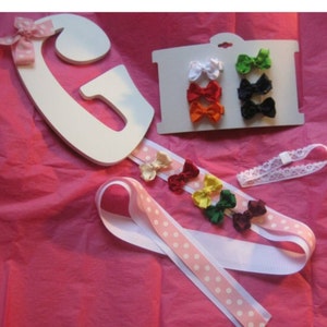 Decorative bow holder with over 6 yards of ribbon. Each ribbon holds at least 24 bows on the front. The back ribbons can also be used to store bows. Fill her up in no time, with our extensive hair bow collections.