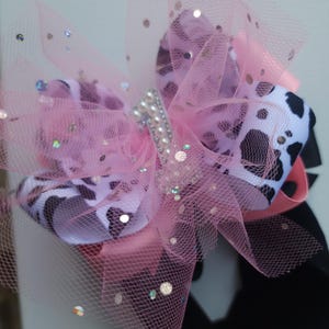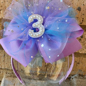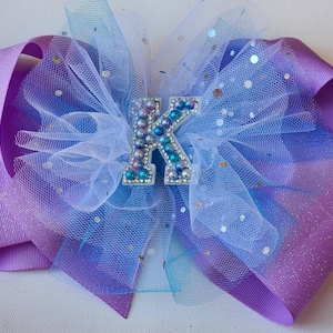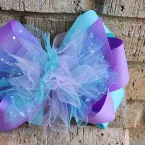 Extra large boutique bow with four layers, and a bling number. The bow is orchid with ocean blue glitter, ocean blue and has orchid and ocean tulle on the top layer. The bow is approximately 8 inches across, and attached to a ribbon lined alligator clip, French barrette, or a thick ponytail holder.