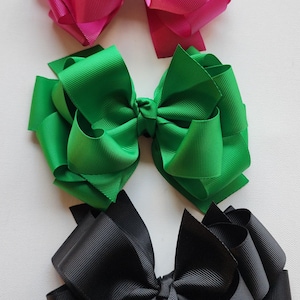 Boutique hair bow with three layers of red ribbons. The bow attached to either a ribbon lined alligator clip, or French barrette (you choose).
